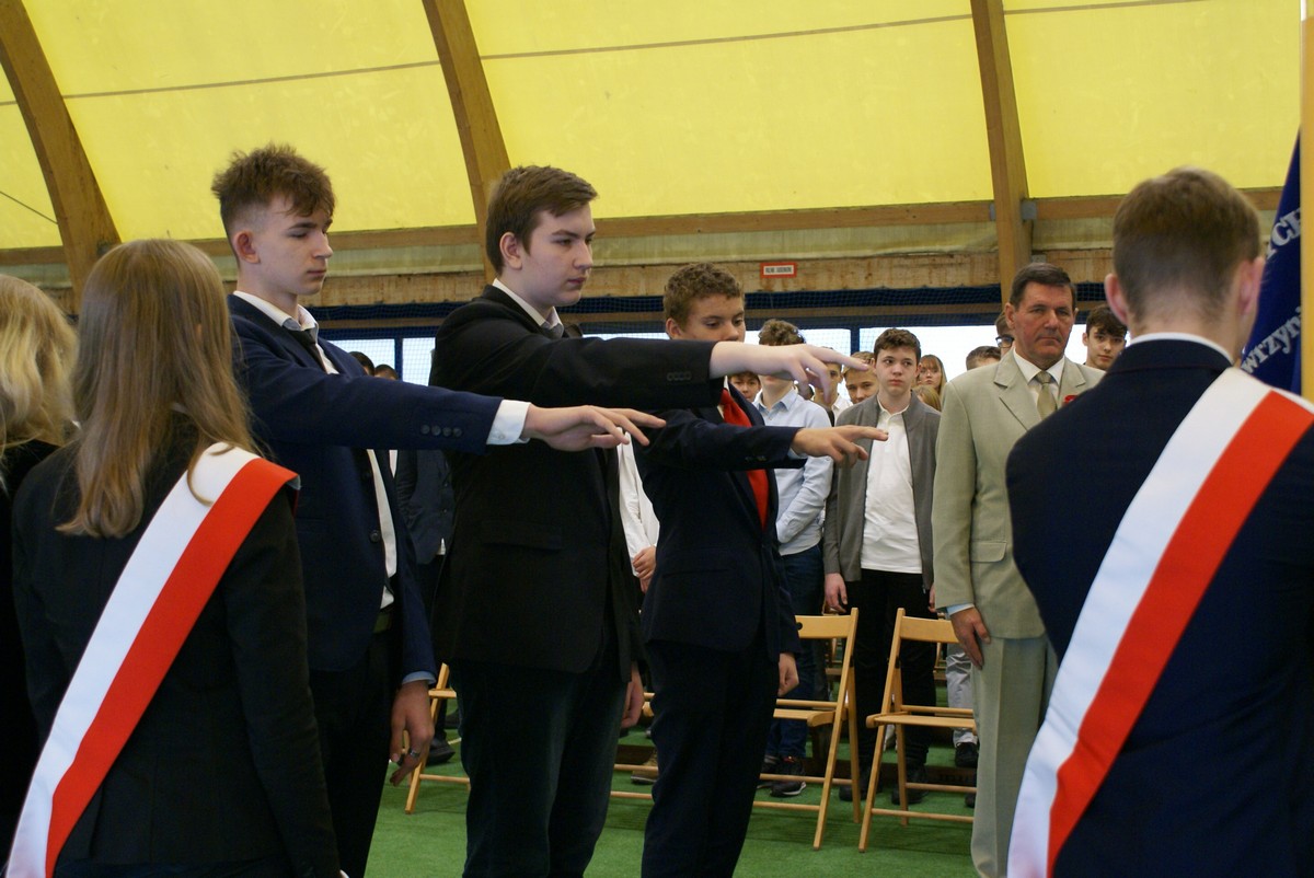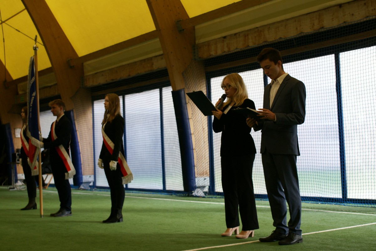 Szkolne świętowanie 104 rocznicy Niepodległości Polski i pasowanie uczniów klas 1 w klimacie "Wesela" Stanisława Wyspiańskiego.