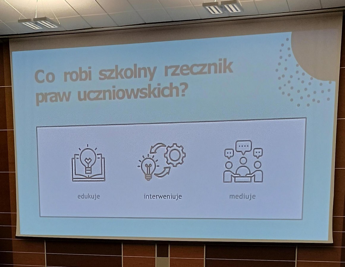 Młodzież miała okazję poznać p. Agatę Dawidowską – Rzeczniczkę Praw Uczniowskich, która opowiadała o swoich obowiązkach i celach rzecznictwa.