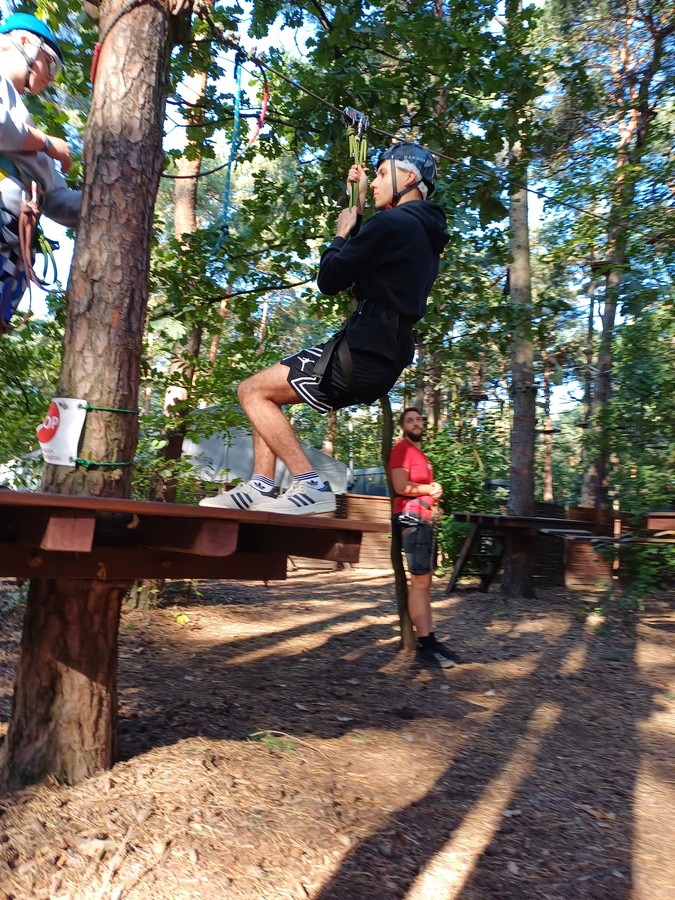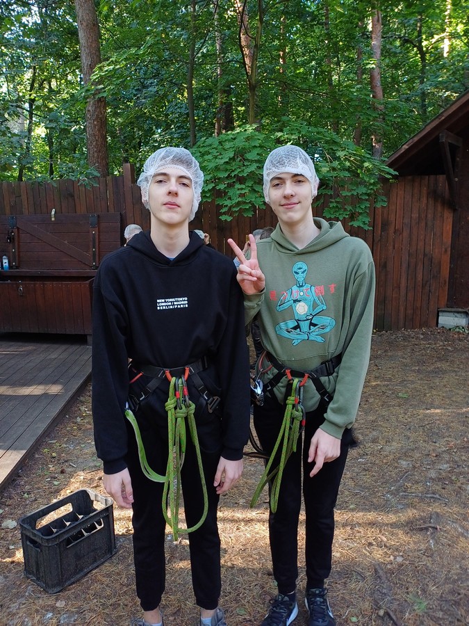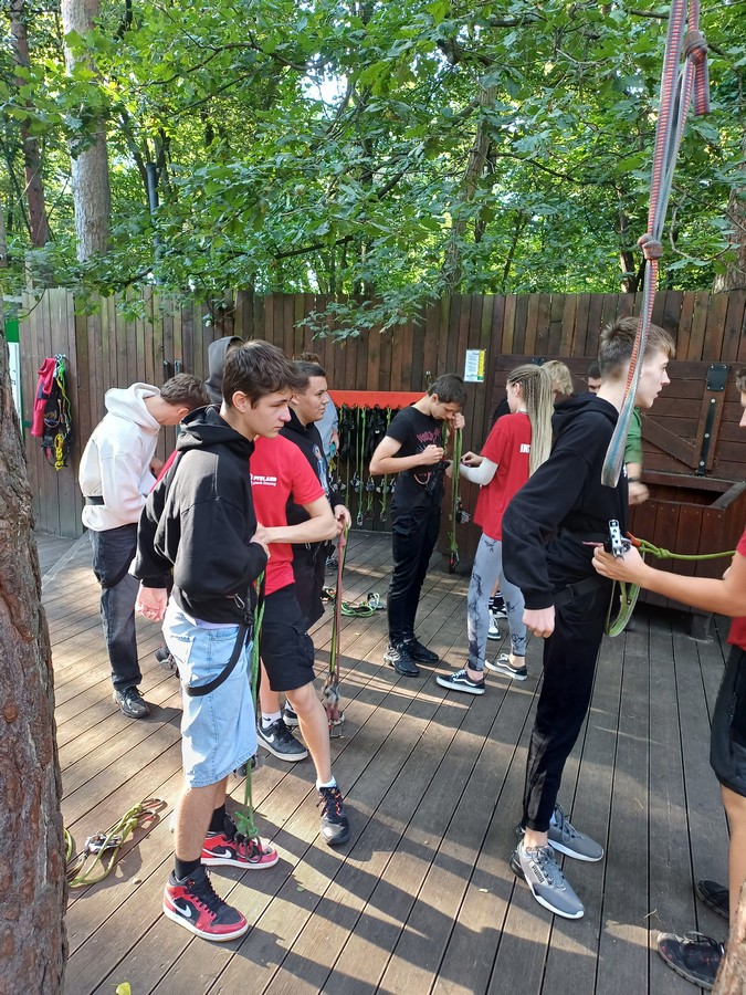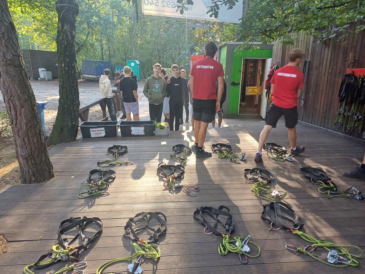 Po krótkim instruktarzu dotyczącym bezpieczeństwa i obsługi sprzętu wspinaczkowego uczniowe przystąpili do pokonywania trasy na której znajdowały się rozliczne przeszkody i tyrolki.