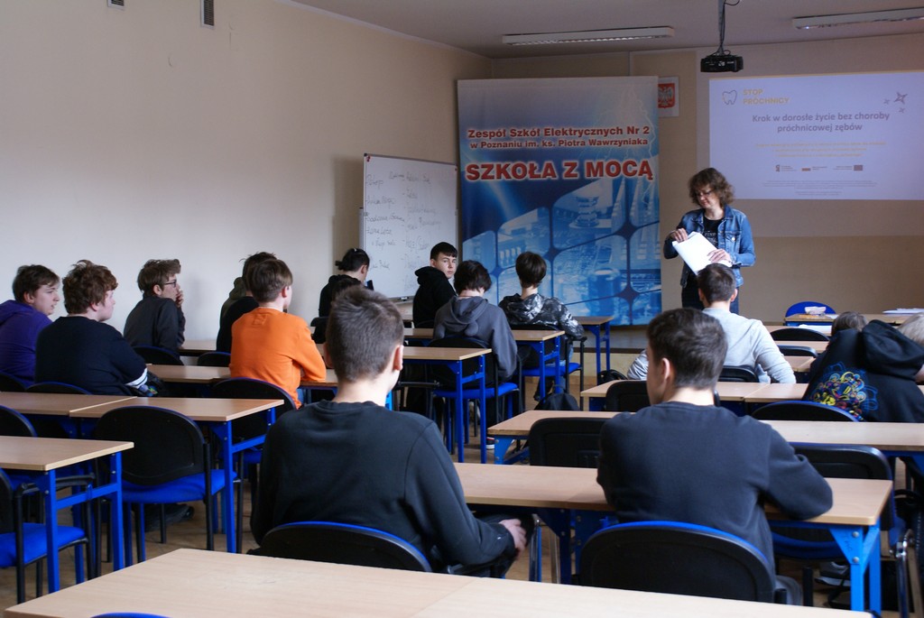Młodzież została zapoznana z zasadami prawidłowej higieny jamy ustnej oraz z zagadnieniami z zakresu właściwych nawyków żywieniowych, diety oraz stylu życia jako elementów wpływających na zdrowe zęby.