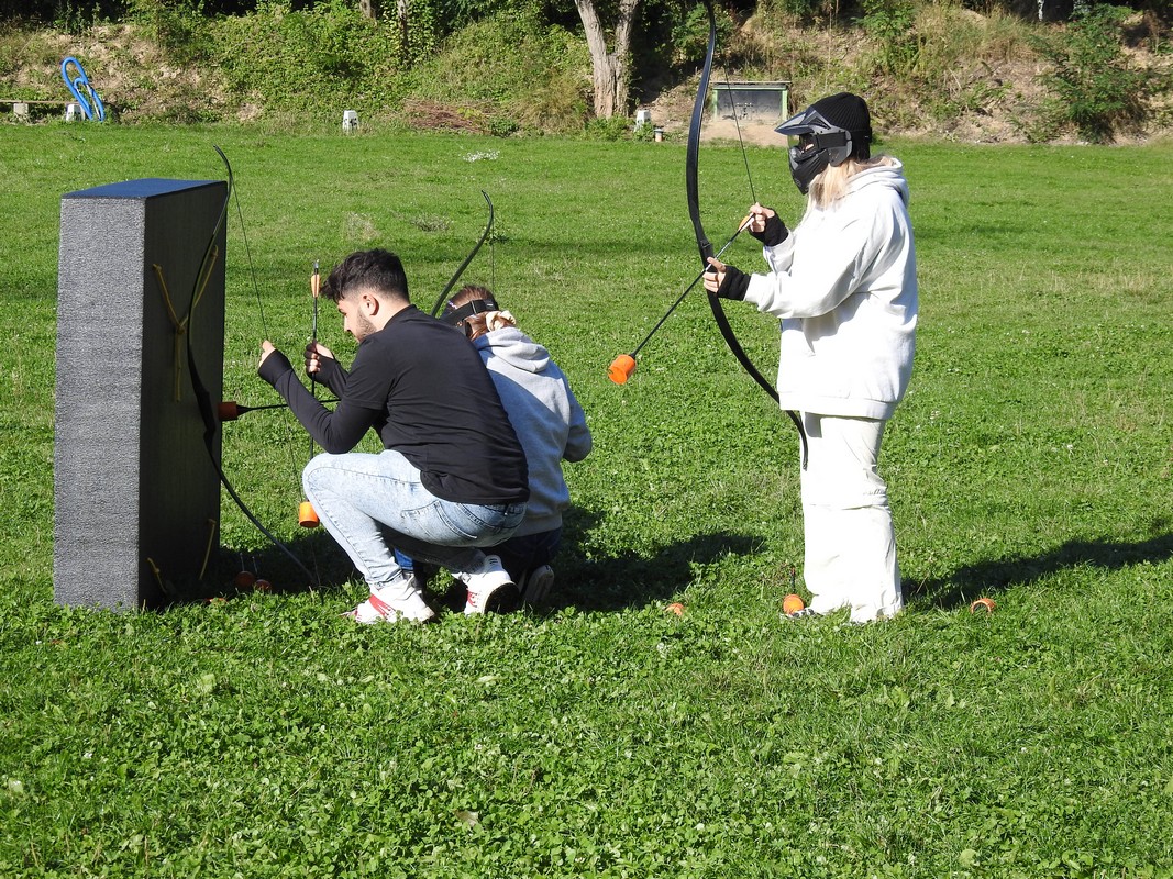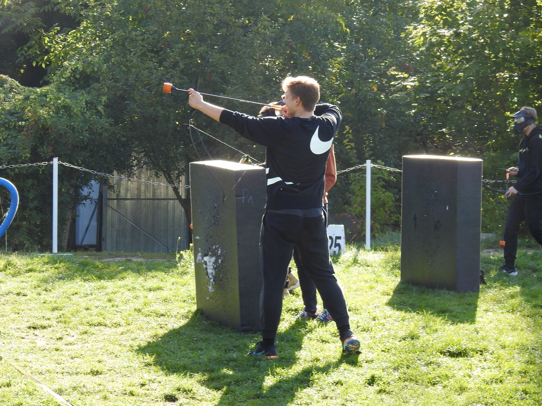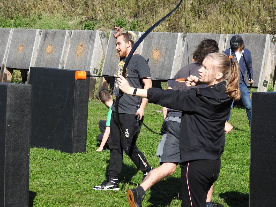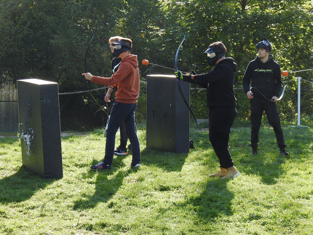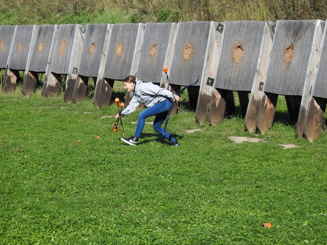 Trener Mariusz przeprowadził szkolenie, podzielił nas na grupy po 6 osób. Po rozdaniu łuków dopadliśmy do strzał, które rozłożone zostały na środku pola walki. Każdy z uczestników łapał trzy strzały i uciekał za maty. Osoby zbyt wolne zostawały trafione strzałą i musiały poczekać pewien czas. Czas oczekiwania uzależniony był od celności kolegów z drużyny, którzy mogli „wykupić” trafionych celnym strzałem w krążek specjalnej maty. Wybicie krążka oznaczało powrót do gry.