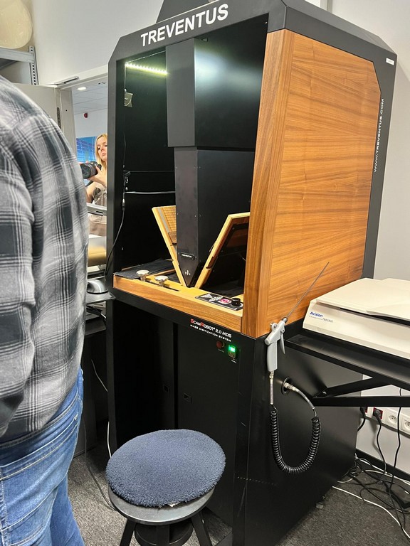 Ostatnim punktem programu była wizyta w Laboratorium Wizualizacji i Interakcji, którego ważnym zadaniem jest digitalizacja dokumentów, książek, starodruków oraz materiałów wielkoformatowych. Zaprezentowano nam automatyczne skanery oraz drukarkę, która umożliwia tworzenie pełnowymiarowych wydruków, co ma zastosowanie m.in. w projektowaniu technicznym i dokumentacji.