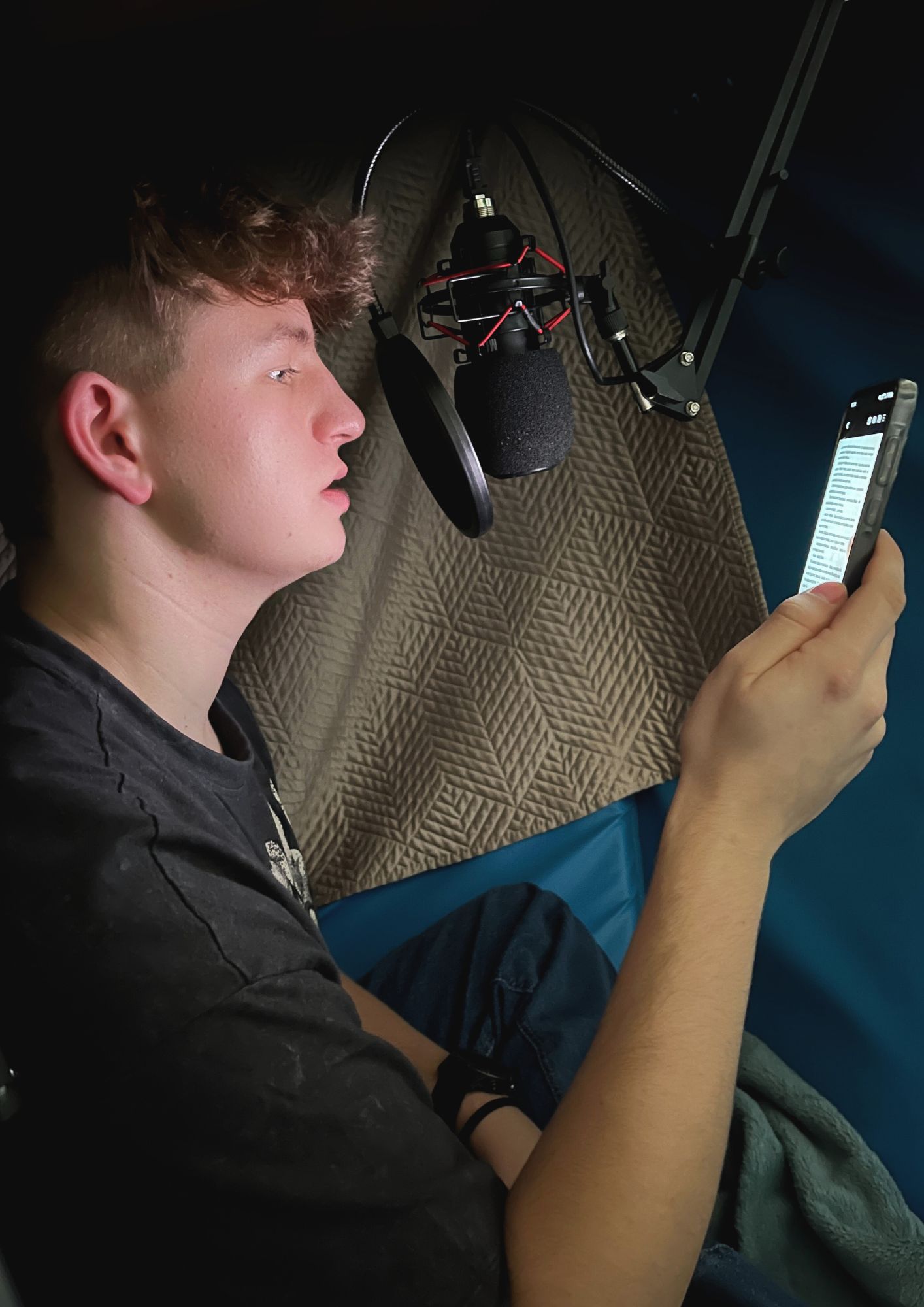 Na studio nagrań wybraliśmy zaplecze siłowni z uwagi na oddaloną lokalizację. Ponieważ w pomieszczeniu dał się słyszeć pogłos, postanowiliśmy przygotować budkę dla lektora, aby wytłumić niepożądane dźwięki i stworzyć dobre warunki akustyczne. Zastosowaliśmy do jej konstrukcji: materace, koce, kołdrę. Ponieważ nagrywaliśmy w trakcie pracy szkoły, o ciszę nadal nie było łatwo. Próby nagrań były wielokrotne, ale nie zniechęcił nas ten fakt i konsekwentnie dążyliśmy do celu, czyli stworzenia profesjonalnie brzmiącego audiobooka.